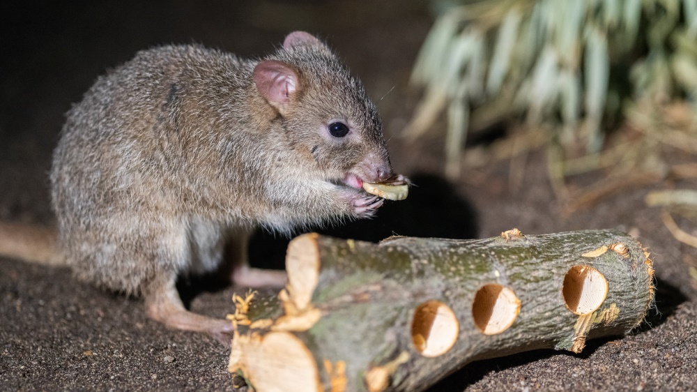 Špalíky z tvrdého dřeva s vyvrtanými otvory a ukrytou potravou se jako potravní enrichment osvědčily například u klokánků králíkovitých. Foto: Petr Hamerník, Zoo Praha.