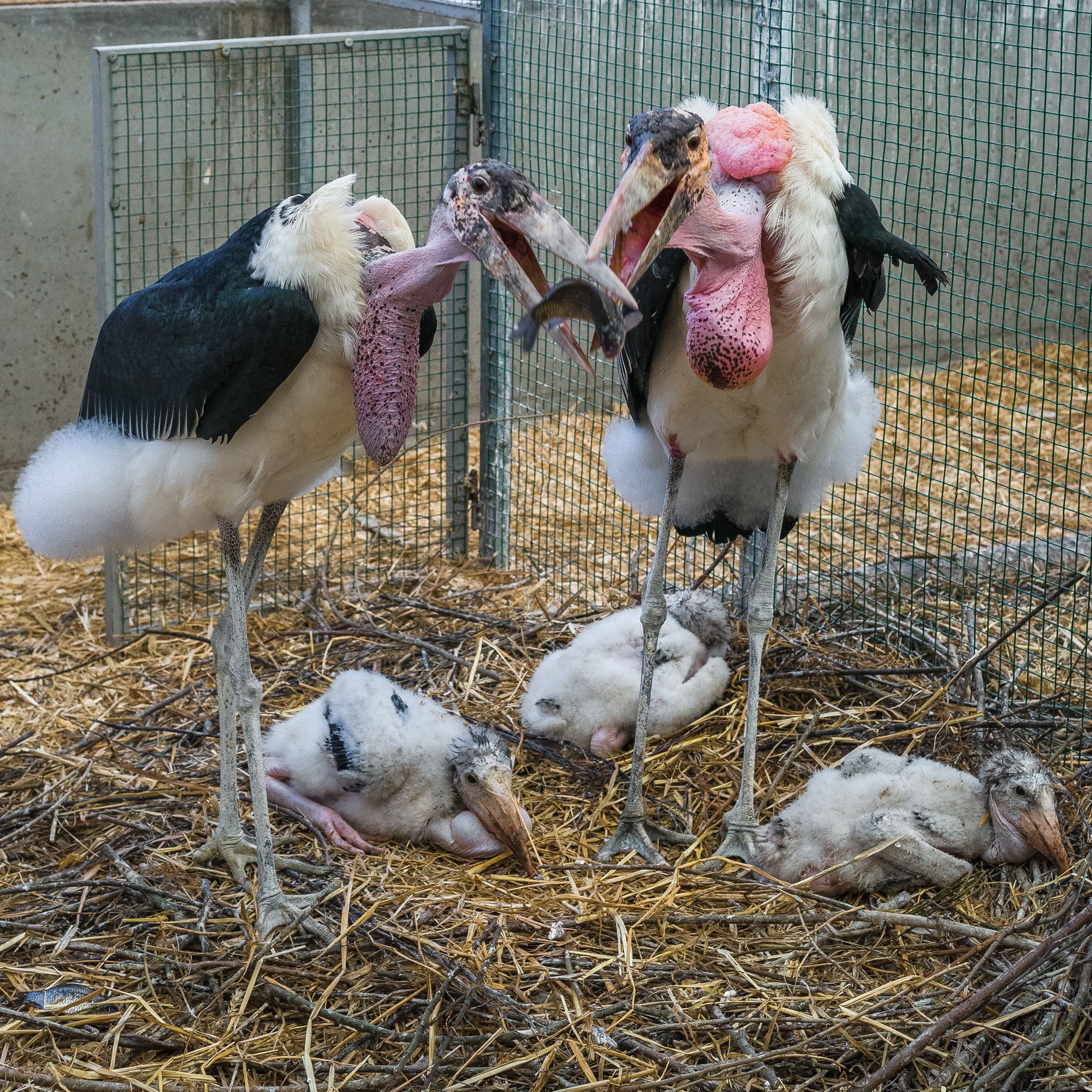 Mláďata čápa marabu vážila při vylíhnutí asi 100 gramů. Díky příkladné péči samice Emy, která je společně s pěstounským otcem Oskarem krmí několikrát denně malými rybkami, dnes váží už čtyři kilogramy. Ptáčata jsou zatím stále v zázemí, k vidění budou na jaře ve Vodním světě.