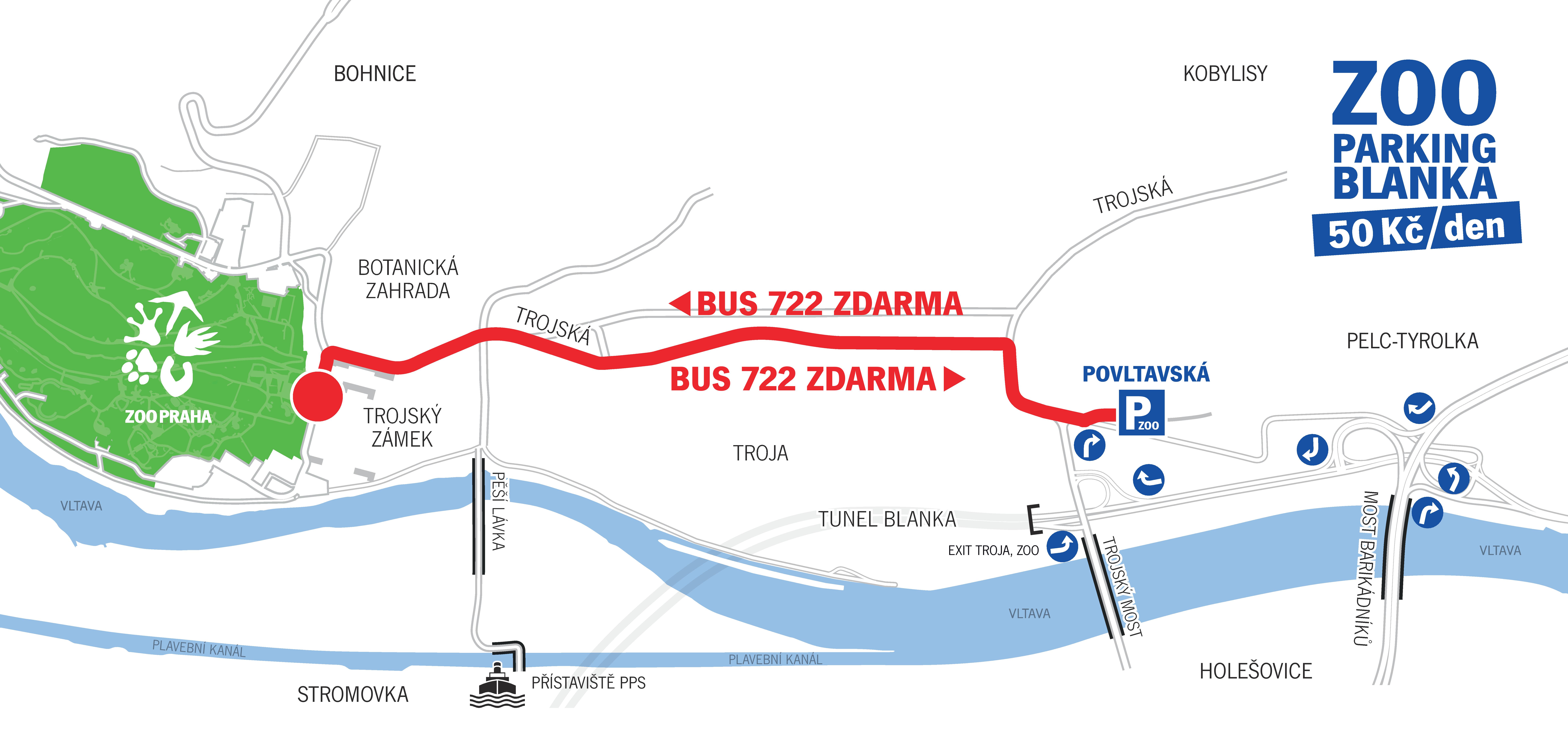 - přepravu mezi Parkingem Blanka a Zoo Praha zajišťuje nízkopodlažní kyvadlový autobus číslo 722