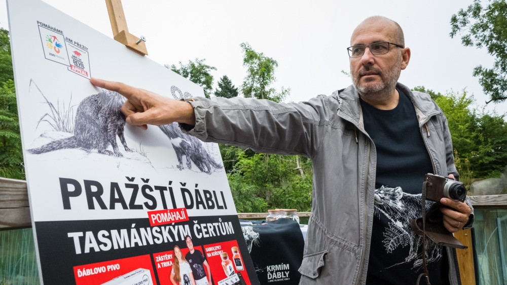 Projekt Pražští dábli pomáhají tasmánským čertům podpoří vývoj vakcíny proti rakovině tváře, která ohrožuje ďábly medvědovité ve volné přírodě. Na fotografii ředitel Zoo Praha Miroslav Bobek s logem záchranného programu Save the Tasmanian Devil Appeal na jehož podporu část výtěžku z prodeje ďábelského merche půjde. Autor: Petr Hamerník, Zoo Praha