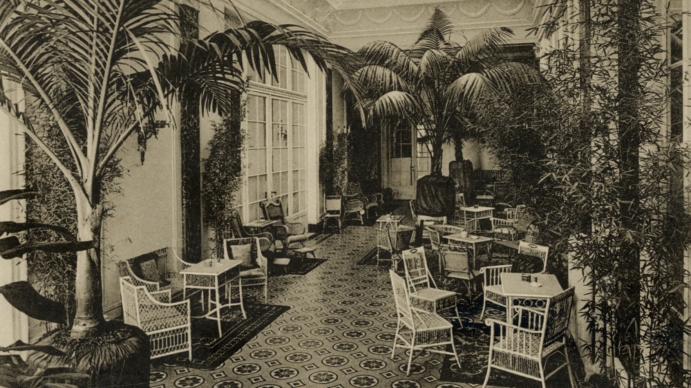 Ta stará pohlednice mi evokuje dobu sklonku 19. a počátku 20. století, kdy pro společenskou smetánku vznikaly na obou stranách Atlantiku přepychové hotely a kdy ho brázdily stále větší parníky. Nejlepšími příklady mohou být pařížský hotel Ritz nebo zaoceánský parník Titanik. Jak v Ritzu, tak na Titaniku bychom našli to, co tenkrát bylo symbolem luxusu a co zachycuje i pohlednice z mé sbírky: palmový salon. Například na Titaniku se palm court nacházel ve Verandah Café na konci promenády první třídy.