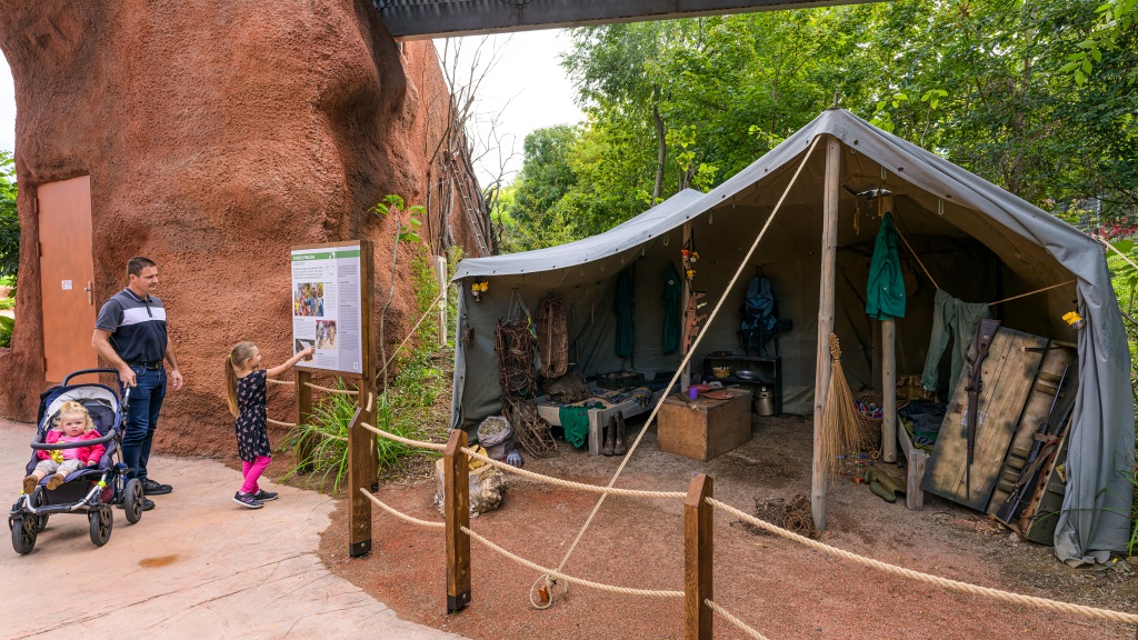 Stan strážců lesa dokresluje autentickou atmosféru okolí pavilonu. Naplněný je skutečnými předměty, které používali kamerunští strážci rezervace, případně jejich replikami. Foto: Petr Hamerník, Zoo Praha