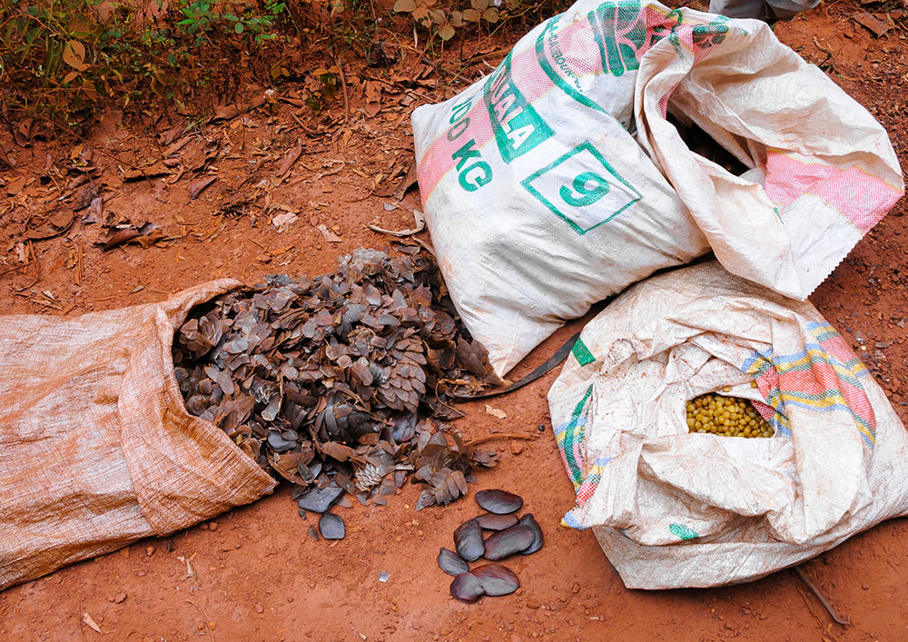 - Pytel s luskouními šupinami. Luskouni se od přelomu tisíciletí stali zřejmě nejpašovanějším druhem savce. K lovu pro maso, k němuž dochází na místě, se přidal i obchod s jejich šupinami, který nasycuje zejména asijskou poptávku po tomto domnělém léčivu.