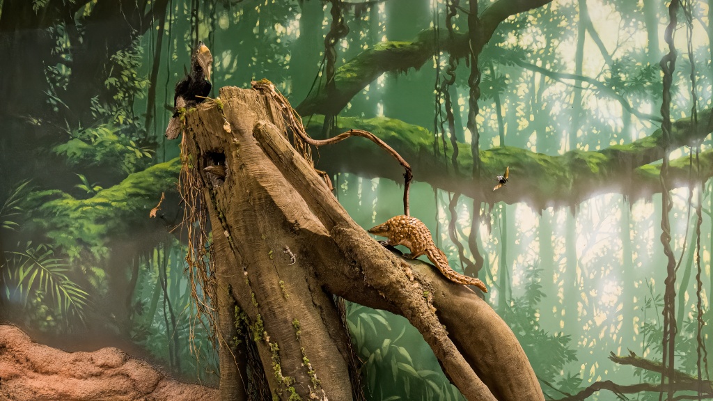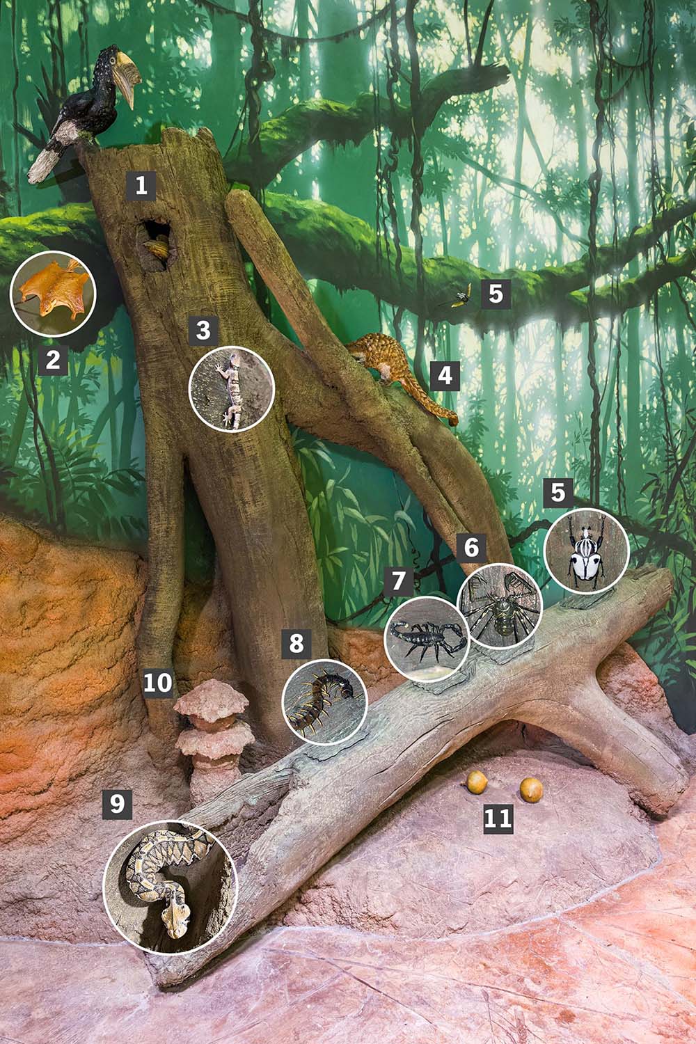 Vertikální dioráma zachycuje vazbu celé řady pralesních druhů na stromy, stojící i padlé, které jim poskytují úkryty, životní prostor a potravu.