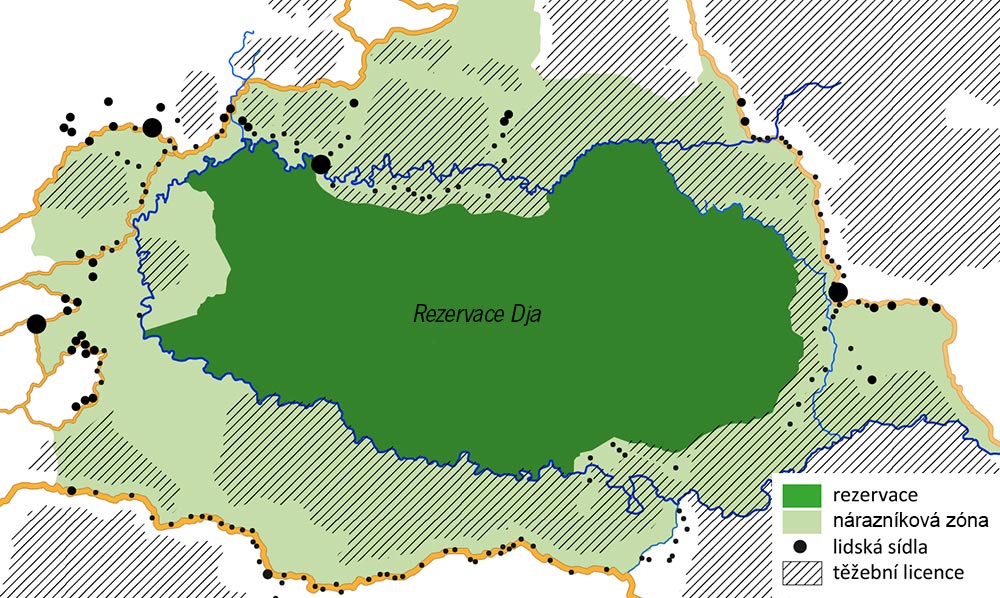 V blízkosti rezervace Dja je těžba dřeva povolena a těžařské licence jsou uděleny pro většinu ploch v jejím okolí. Pokud by došlo k masivnímu odlesňování, ztratí jednotlivé populace zvířat mezi sebou kontakt. Proto je důležitá nejen ochrana izolovaných území, ale i koridorů, které je vzájemně propojují.