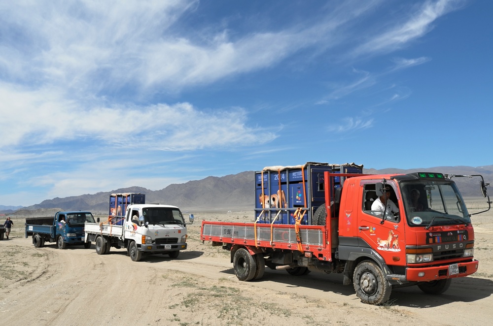 Po více než 30 hodinové cestě opustily tři klisny koně Převalského transportní boxy a stanuly v zemi svých předků, v poušti Gobi B. Zoo Praha tak úspěšně zakončila čtvrtý transport do Mongolska realizovaný v rámci projektu Návrat divokých koní.
