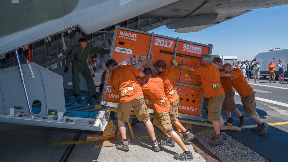 Nakládání jedné ze čtyř klisen do armádního letounu. Foto: Petr Hamerník