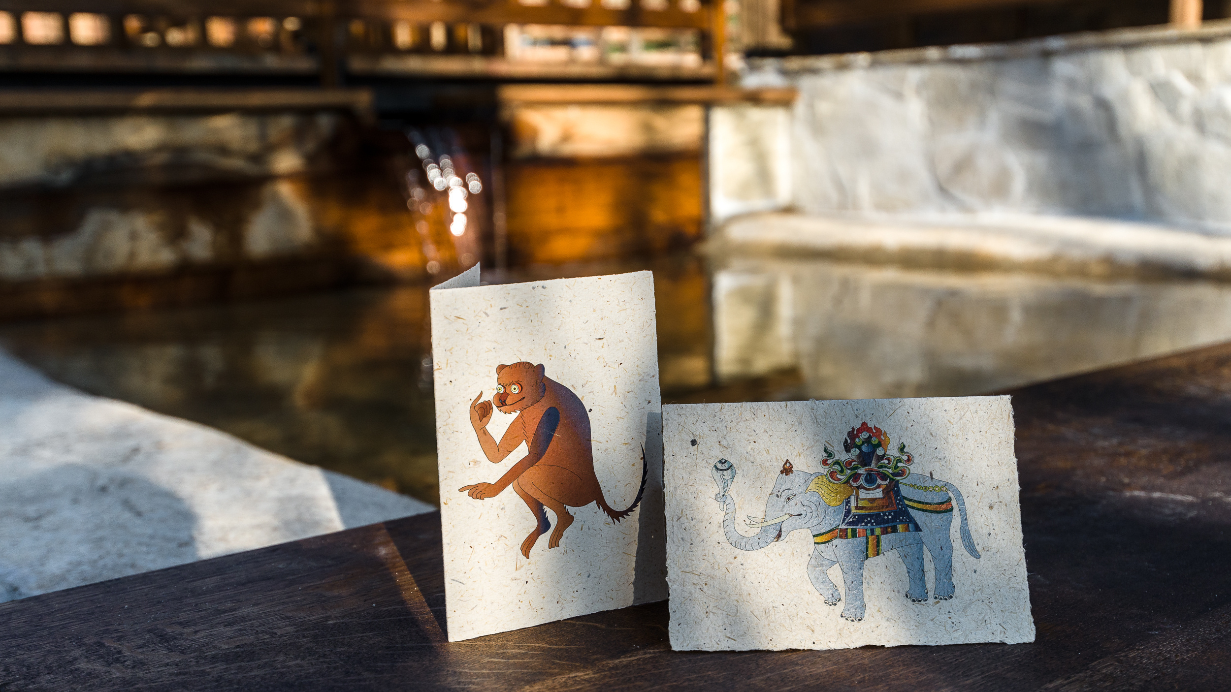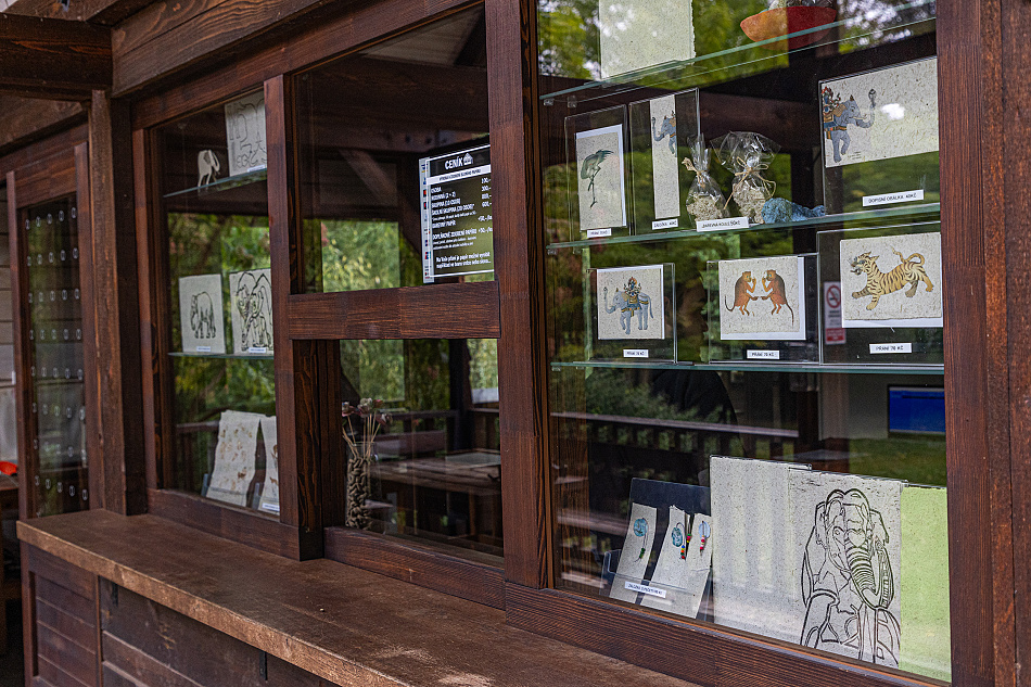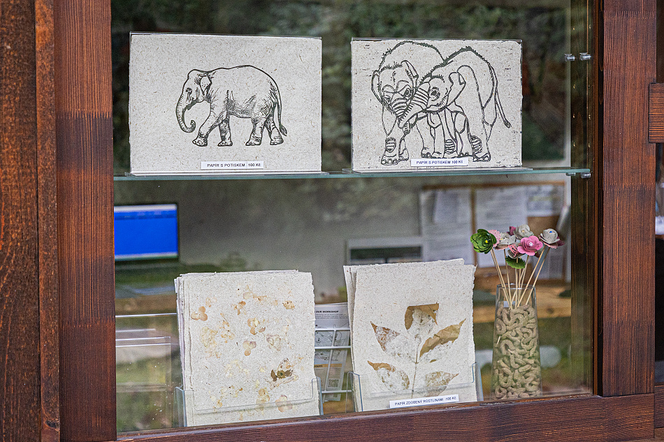 Přímo v naší Papírně si také můžete zakoupit originální výrobky zhotovené speciálně pro Zoo Praha v Ruční papírně Velké Losiny, případně sloní papír „na doma“ – granulát s návodem, ze kterého si vlastní sloní papír můžete vyrobit v klidu svého domova.