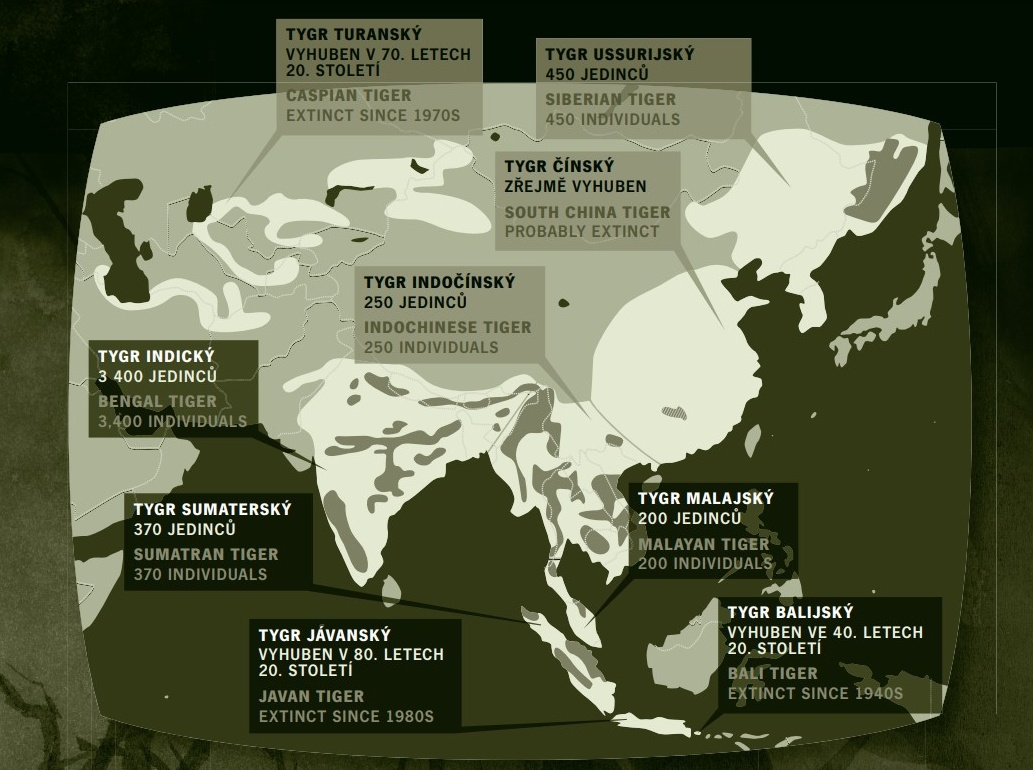 Tygři v minulosti obývali rozsáhlý areál a velkou škálu nejrůznějších prostředí. Z devíti známých poddruhů jich však dnes vinou člověka přežívá ve volné přírodě pouze pět, a i ty žijí jen na zlomku svého původního území.