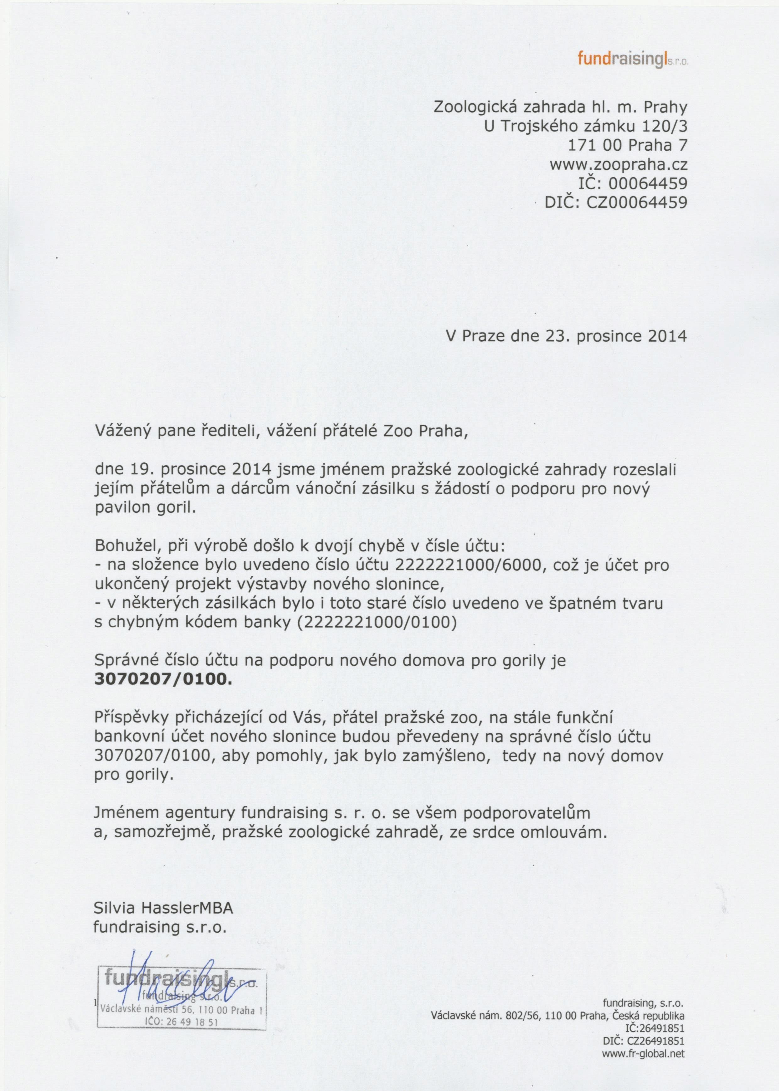 Dne 19. prosince 2014 agentura fundraising s. r. o. rozeslala přátelům Zoo Praha vánoční zásilku s žádostí o podporu pro nový pavilon goril, kde byl bohužel uveden nesprávný tvar bankovního účtu.Omluvu kolegů z agentury fundraising s. r. o. za vzniklou chybu naleznete v přiloženém dopise.