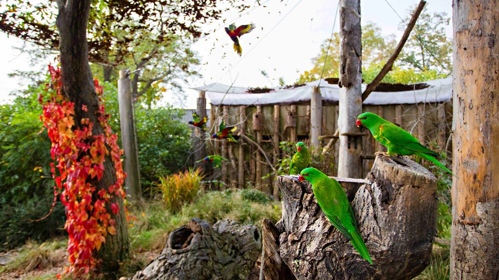 Тропа, соединяющая экспозицию белых медведей с верхней станцией канатной дороги, главным образом принадлежит попугаям. Здесь в четырех двойных вольерах живут теплолюбивые лори, карликовые попугаи и висячие попугайчики – виды небольших размеров, естественная среда обитания которых Австралия. Изюминка тропы – большой проходной вольер со свободно летающими попугаями и другими видами птиц. Проходя по вольеру, посетители как бы попадают в лесистую заросшую кустарником Австралию.