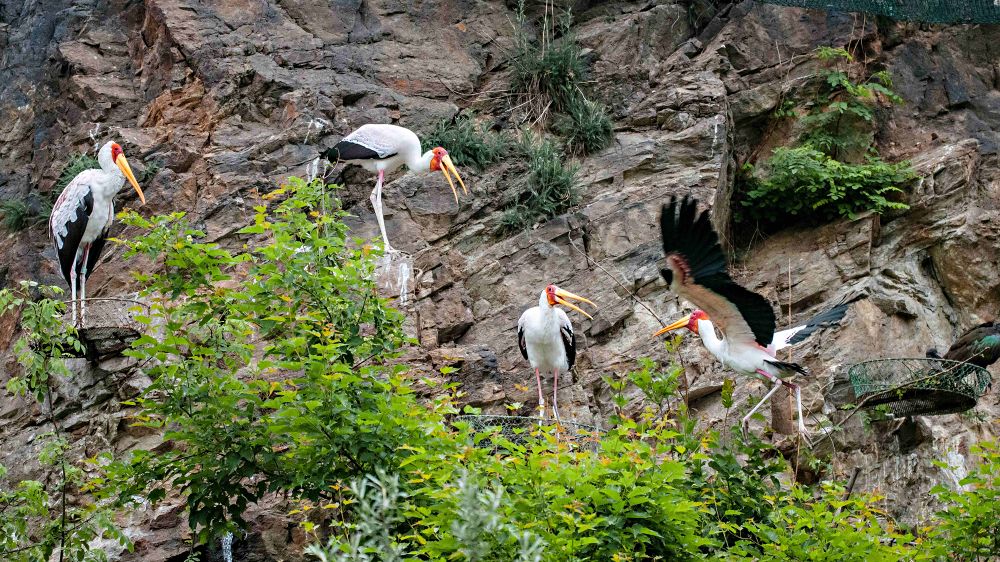 Вдоль дороги, идущей от главного входа в зоопарк, расположена система просторных вольеров, непосредственно связанных со скальным массивом, который является для них уникальными природным фоном. Два из этих вольеров проходные, что позволяет посетителям насладиться близкой встречей с птицами.