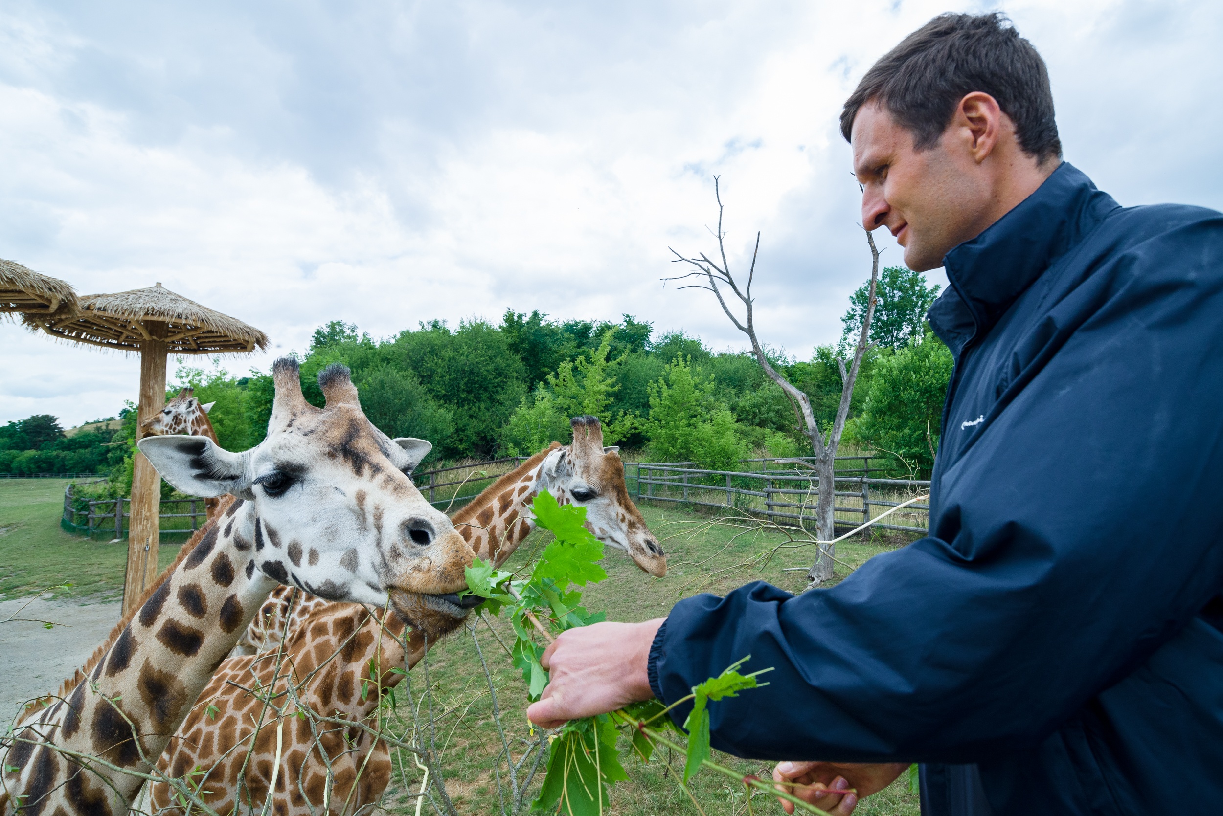 Hostem nedělní akce a jedním z prvních, kteří si krmení žiraf mohli vyzkoušet na vlastní kůži, byl nejlepší český basketbalista posledních let Jiří Zídek. Ve 14.00 oficiálně otevřel novou krmnou plošinu u výběhu žiraf Rothschildových.