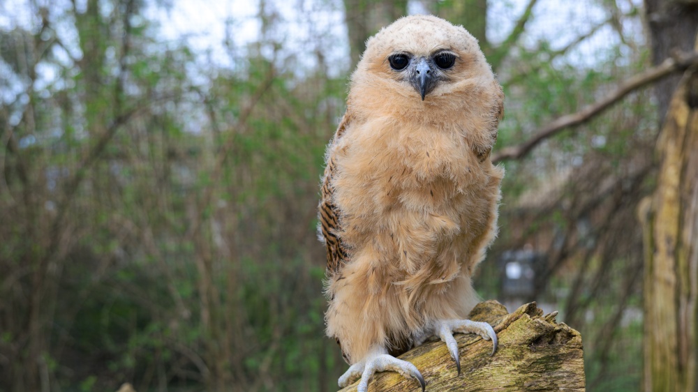 Mládě rybožravé sovy ketupy Pelovy je ve věku tří měsíců dobře pozorovatelné ve voliéře u Pavilonu tučňáků. Foto Petr Hamerník, Zoo Praha
